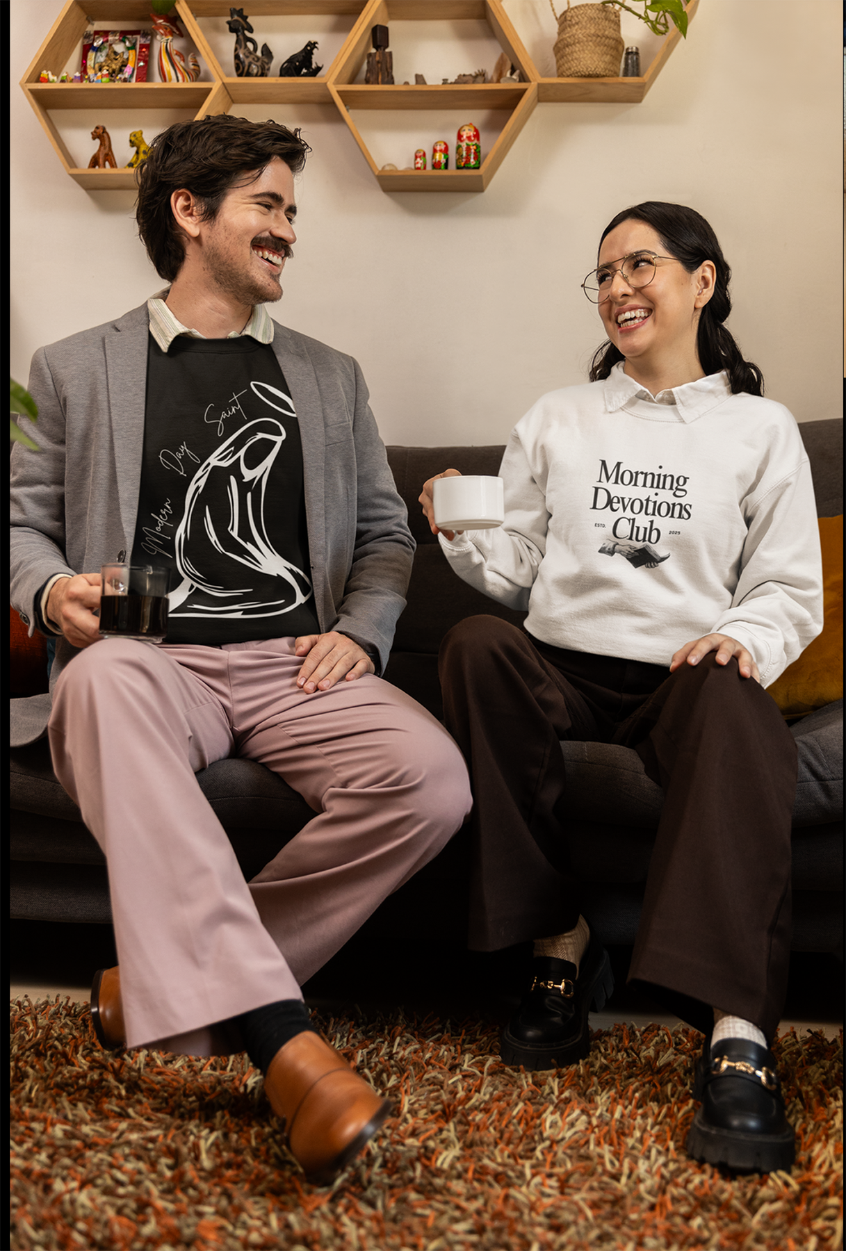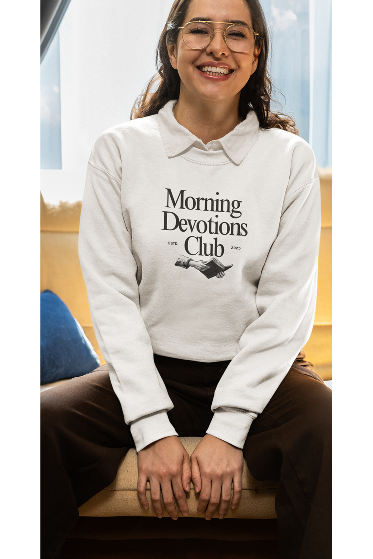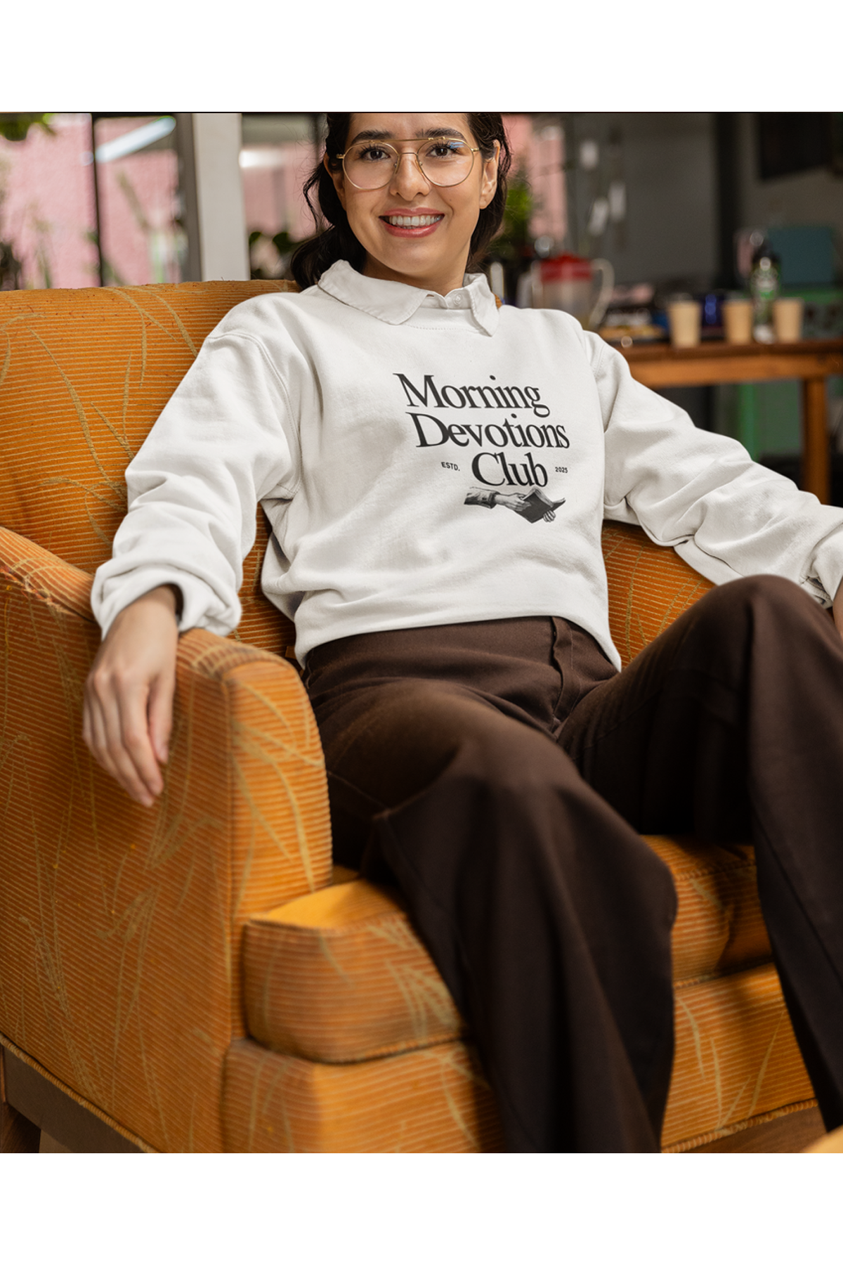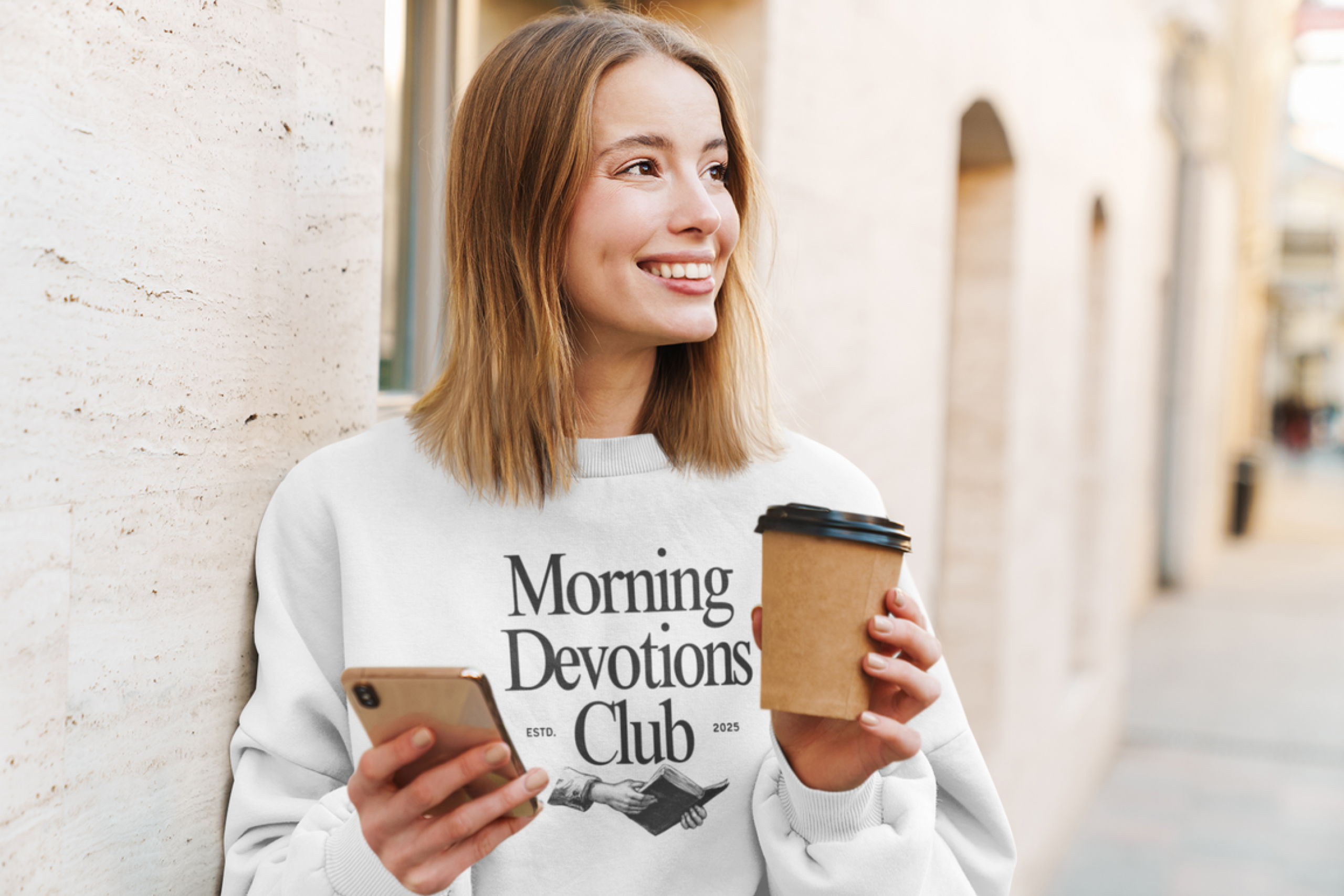 The Morning Devotions Club sweatshirt was made for early risers and soul seekers — the women who meet God in the stillness before the world wakes. Designed with a relaxed fit and cloud-soft fabric, this piece is your go-to layer for coffee, candlelight, Scripture, and surrender.